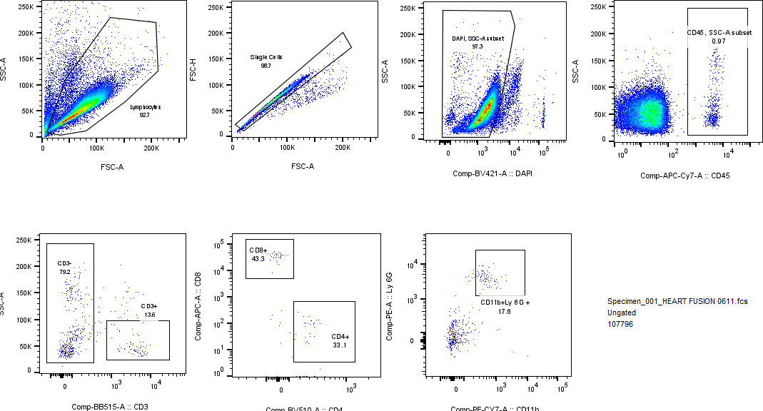 Flow cytometric analysis of mouse heart tissue was performed using the following antibody panel: PE-conjugated rat anti-mouse Ly-6G (A27159), PE/Cyanine7-conjugated rabbit anti-mouse CD11b (A27339), APC/Cyanine7-conjugated rabbit anti-mouse CD45 (A26831), ABflo® 488-conjugated rat anti-mouse CD3 (A27161), ABflo® 647-conjugated rabbit anti-mouse CD8a (A24942), and ABflo® 500-conjugated rabbit anti-mouse CD4 (A27843). The analysis demonstrated clear separation between positive and negative populations within both T lymphocyte and neutrophil compartments.