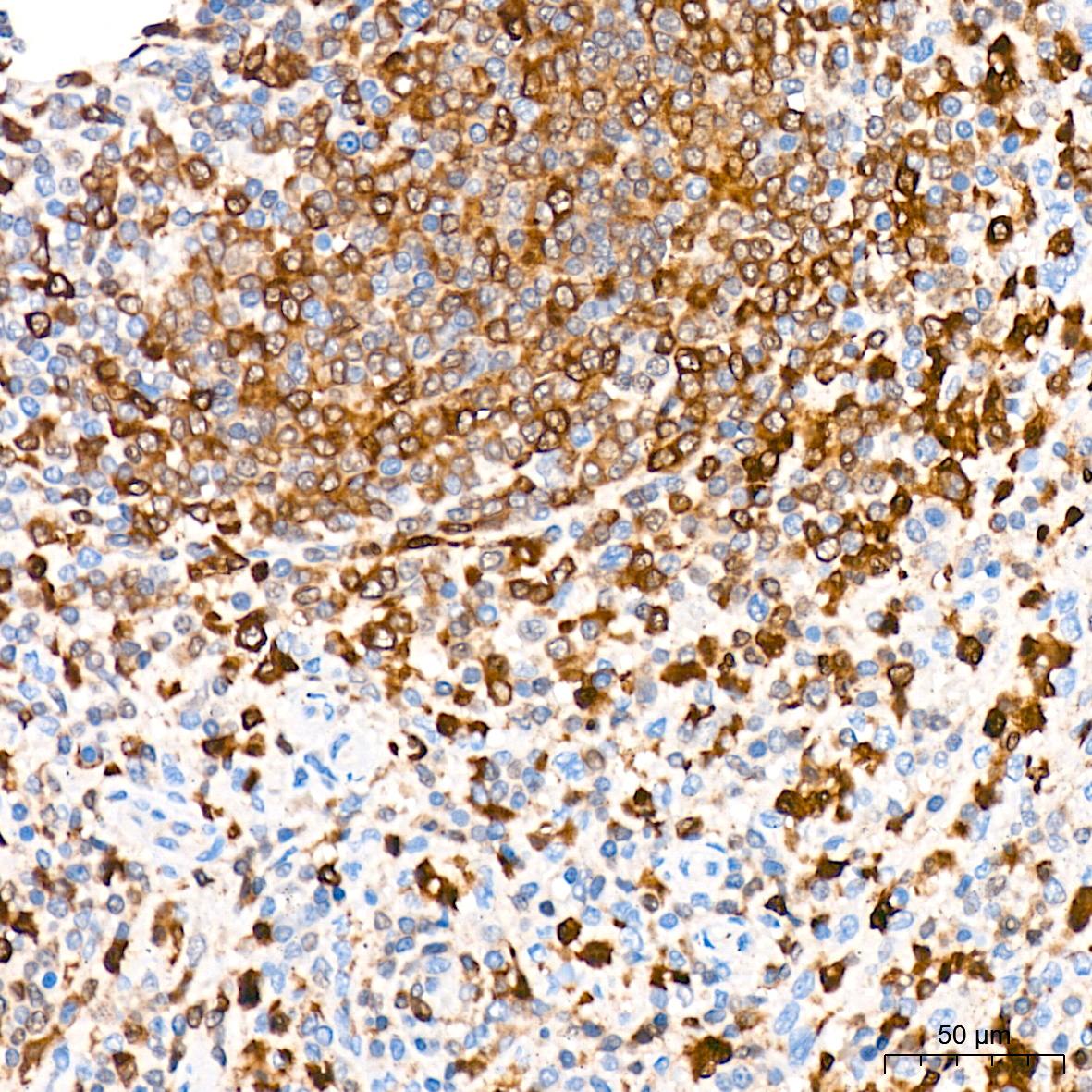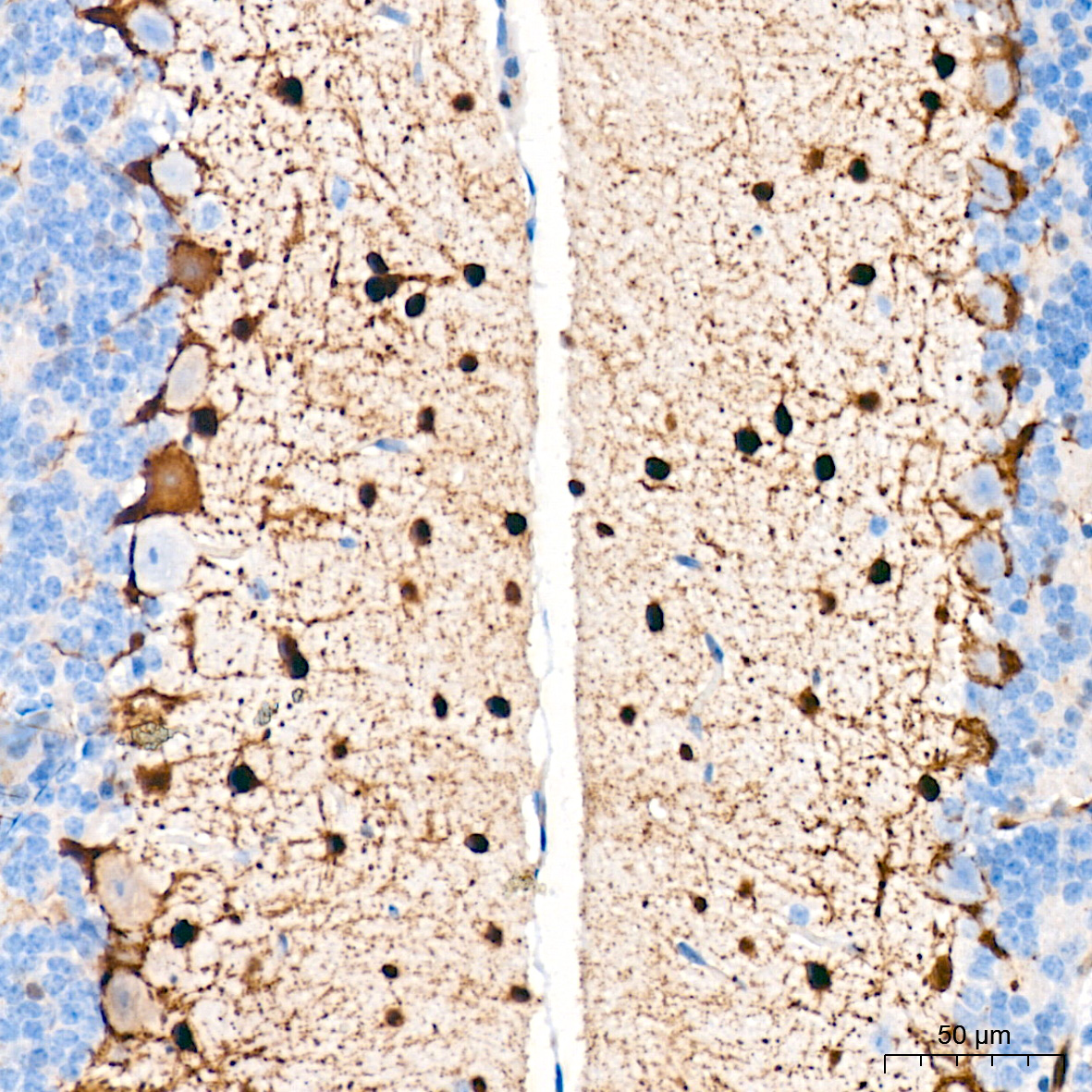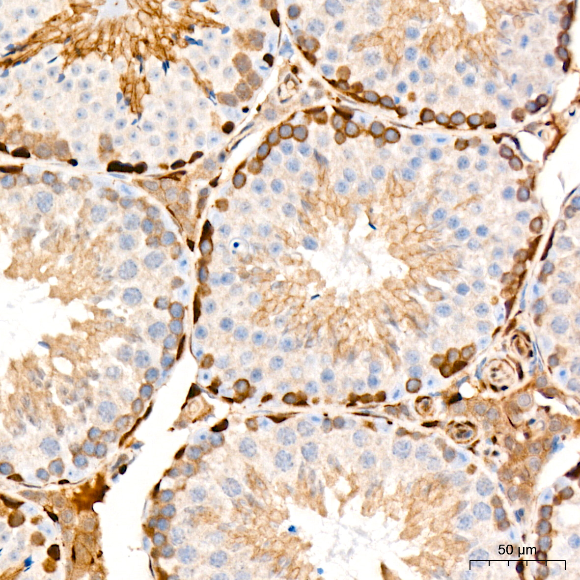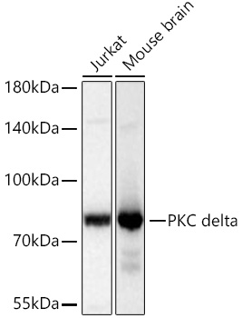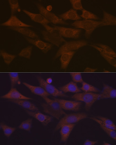 Confocal imaging of NIH/3T3 cells using ERK1/2 Rabbit mAb (A4782, dilution 1:200) followed by a further incubation with Cy3-conjugated Goat Anti-Rabbit IgG (H+L) (AS007, dilution 1:500) (Red). The cells were counterstained with α-Tubulin Mouse mAb (AC012, dilution 1:400) followed by incubation with ABflo® 488-conjugated Goat Anti-Mouse IgG (H+L) (AS076, dilution 1:500) (Green). DAPI was used for nuclear staining (Blue). Objective: 100x.