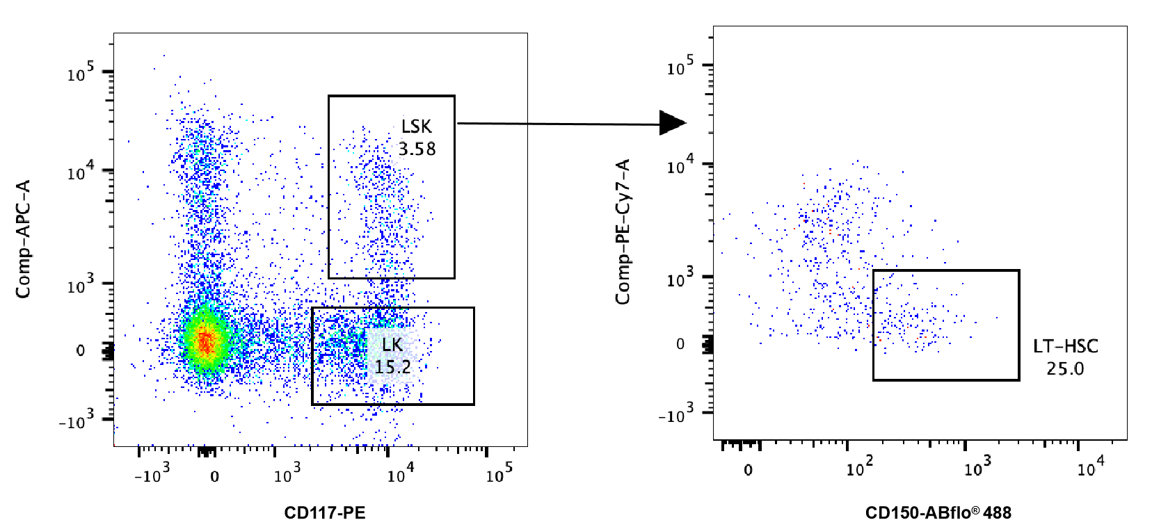 Flow cytometry analysis of mHSCs using PE Rabbit anti-Mouse CD117/c-Kit mAb (A24596) and ABflo® 488 Rabbit anti-Mouse CD150/SLAM mAb (A24971) at 1:1000 dilution. clearly classified positive and negative cells.