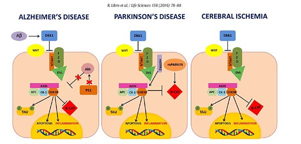 Alzheimer's disease (AD) is a progressive neurodegenerative disorder, characterized by the progressive loss of cholinergic neurons, resulting in mental decline and loss of cognitive processes including memory, judgment and reasoning. The main pathological hallmarks of AD are senile plaques, due to the insoluble Amyloid Beta (Aβ) aggregation and the Neurofibrillary Tangles (NFTs), formed by the hyperphosporylated microtubule-associated protein Tau[44].TheWnt signaling plays a central role in synaptic stability [45]as well as in the maintenance of blood-brain barrier (BBB) integrity [46].
