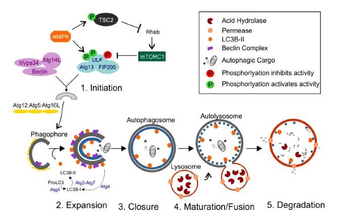 Autophagy is an evolutionarily conserved cellular degradation pathway that involves breakdown of cytoplasmic components by the lysosome. Although “autopahgy” was described in the late 1950s, its mechanism was elucidated much later using yeast genetics. Expectedly, the discovery of autophagy has won the Noble Price. Because it provided a new sight into the normal physiologically process and a new target for many disease therapy. Autophagosome formation requires three main steps: initiation, nucleation, and expansion. In general, autophagy is categorized by three main types: microautophagy, chaperone-mediated autophagy (CMA), and macroautophagy[3, 4].
